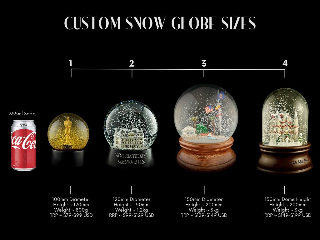 *Pricing indications are for 100mm size custom snow globes minus freight costs. World-wide delivery is available, pricing varies depending on globe design, quantity and delivery location. For firm pricing based on your unique design requirements, please request a consult, quote & 2D design using the “Get Quote” button in the top menu.