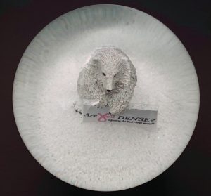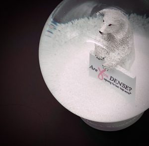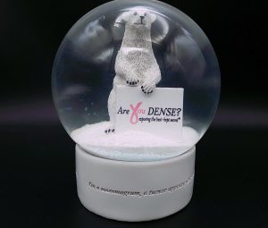 It was our honor to produce these custom snow globes for Are You Dense. The base reads, “On a mammogram, a tumor appears white and so does dense tissue…there is no contrast. It is like trying to find a polar bear in a snowstorm.” You can find out more about the mission of Are You Dense and place an order for this super cute globe at https://www.areyoudense.org/