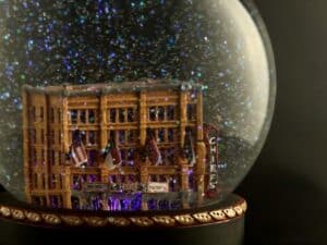 Our custom snow globe pays tribute to this musical mecca with an intricately detailed miniature replica of the building’s impressive exterior. The magic really comes alive with color-changing LED lights that illuminate the windows, creating that unmistakable Broadway glow in miniature. But perhaps the most enchanting feature is the built-in music box that plays a delicate, twinkly rendition of Eric Church’s hit song “Springsteen” – adding an extra layer of musical wonder to this already magical piece.