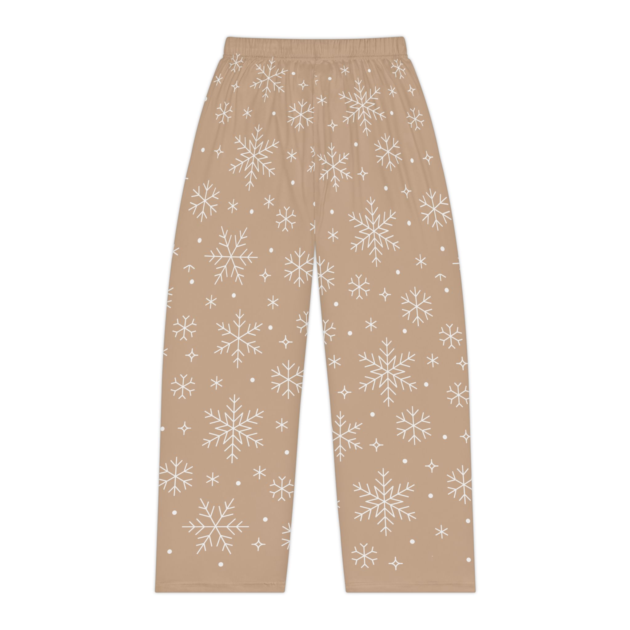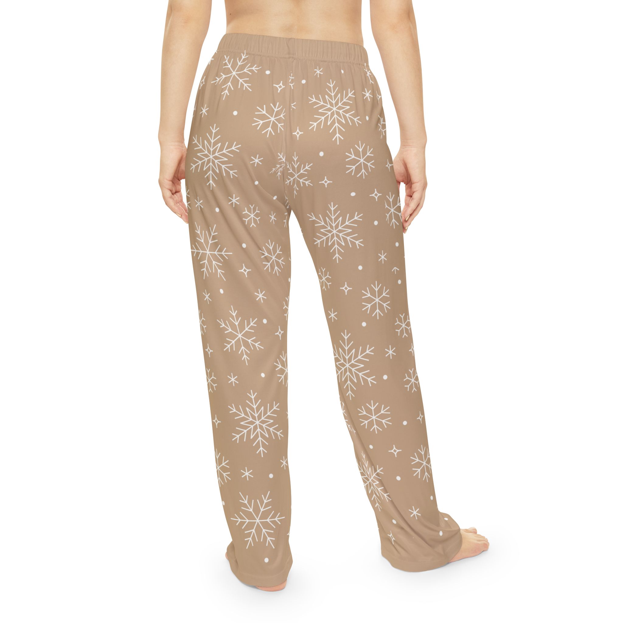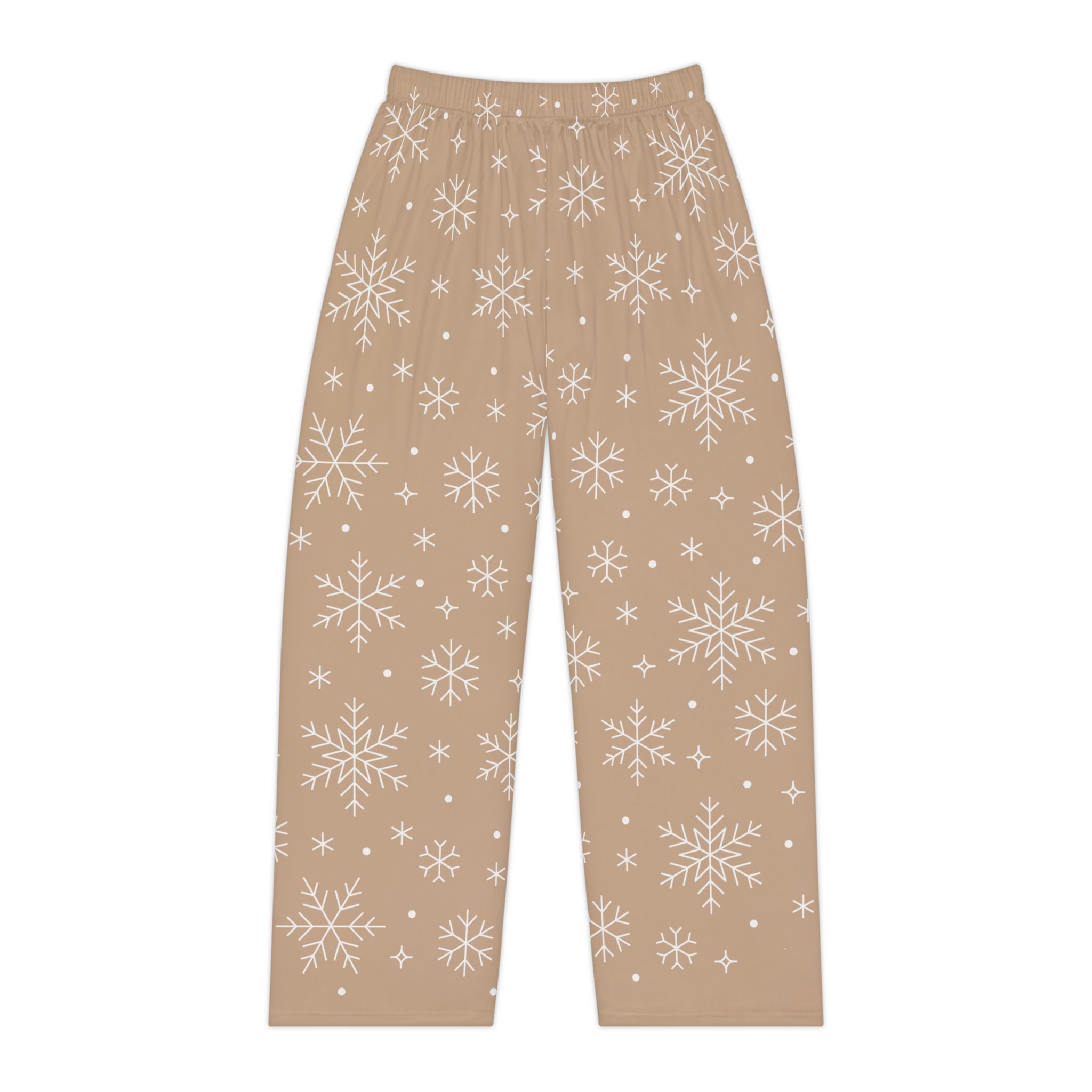 Slide into slow mornings and cozy evenings with these pajama pants that feel like a warm, woolen hug without the weight. Soft brushed polyester skims the skin, while the elastic waistband moves with you through stretches of breakfast, book-sinking, or late-night tea. A gentle, sandy-taupe ground is dusted with delicate white snowflakes — quiet, whimsical, and calm. These pants pair easily with an oversized sweater or a slouchy tee for nights when you want comfort that still reads thoughtful and composed. Wear them for winter nights by the window, for relaxed holiday mornings, or whenever you crave a calm, cozy ritual.