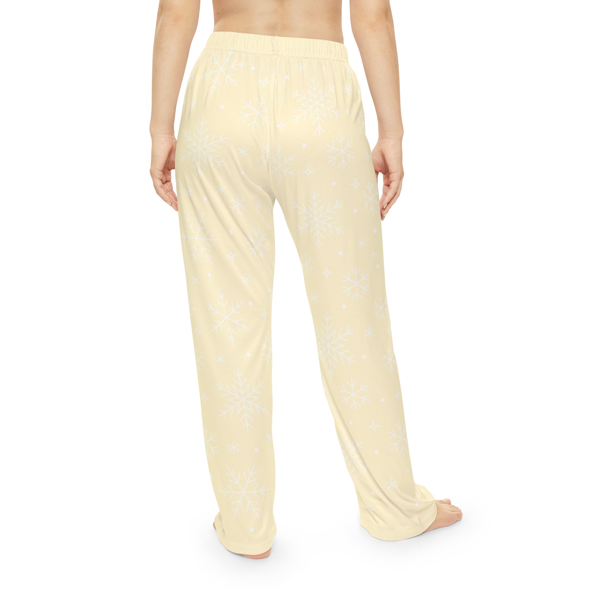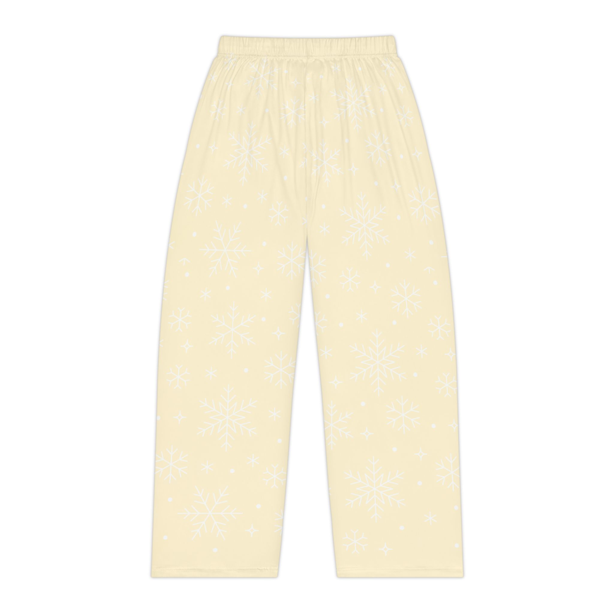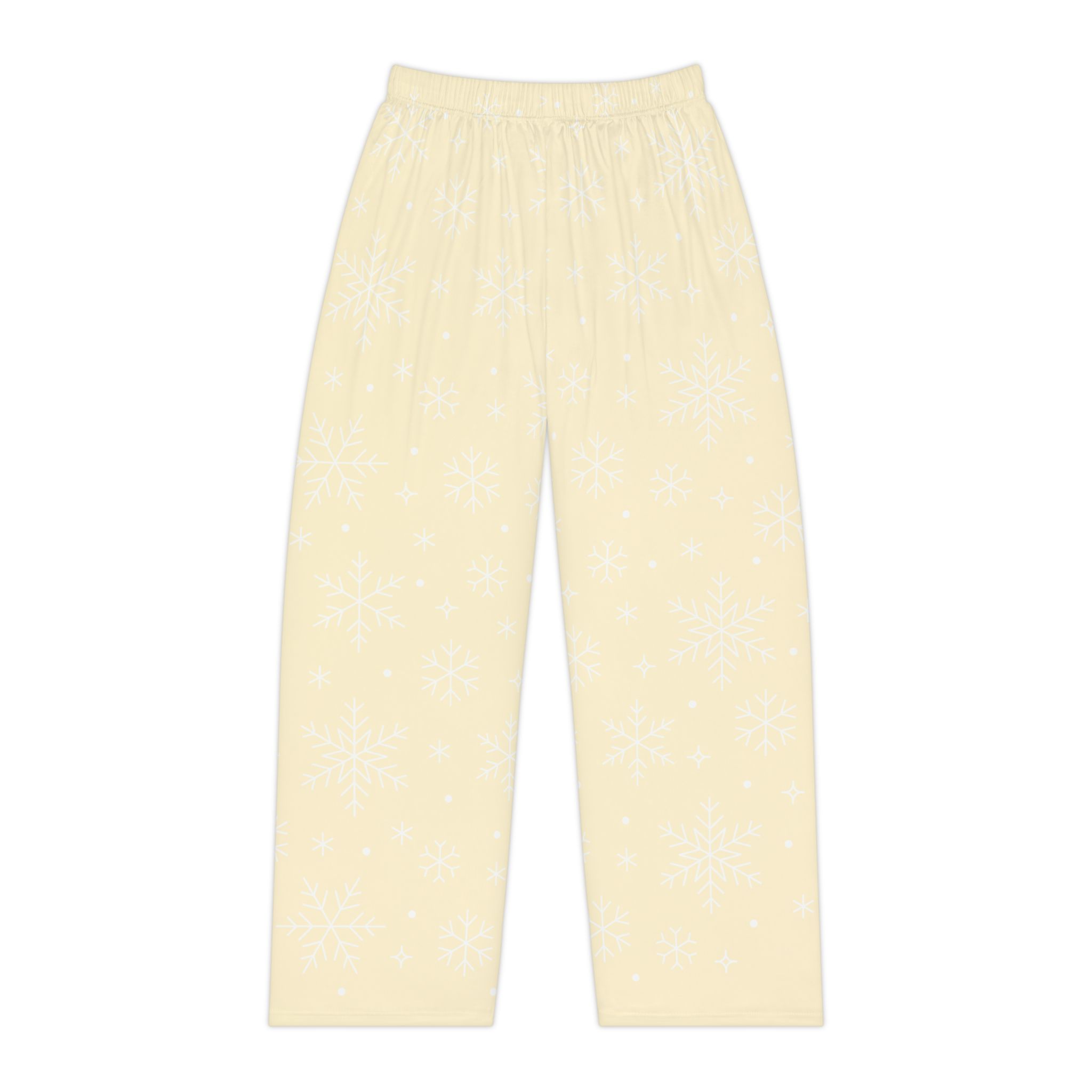 Slide into slow mornings and cozy evenings with these pajama pants that feel like a warm, woolen hug without the weight. Soft brushed polyester skims the skin, while the elastic waistband moves with you through stretches of breakfast, book-sinking, or late-night tea. A gentle, sandy-taupe ground is dusted with delicate white snowflakes — quiet, whimsical, and calm. These pants pair easily with an oversized sweater or a slouchy tee for nights when you want comfort that still reads thoughtful and composed. Wear them for winter nights by the window, for relaxed holiday mornings, or whenever you crave a calm, cozy ritual.