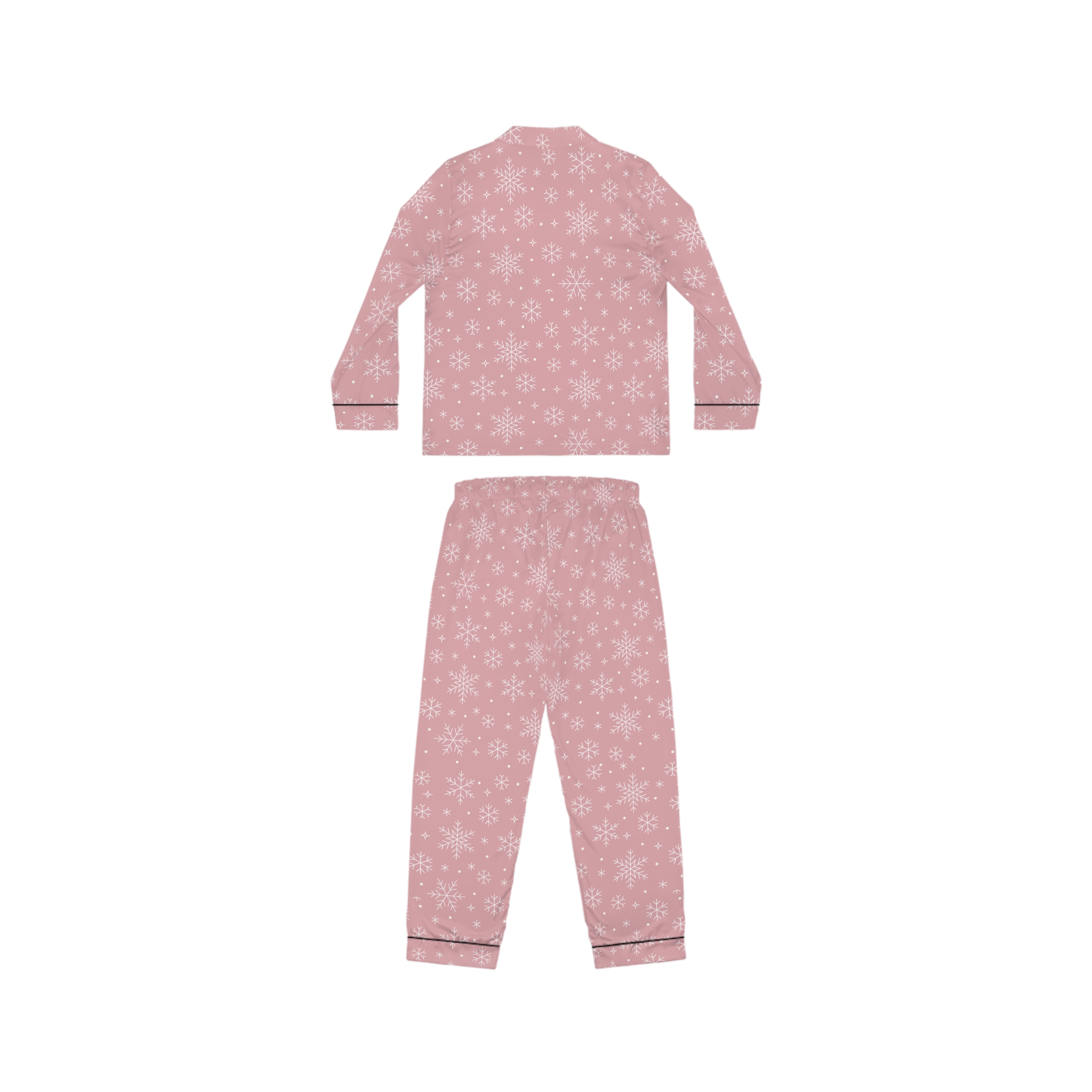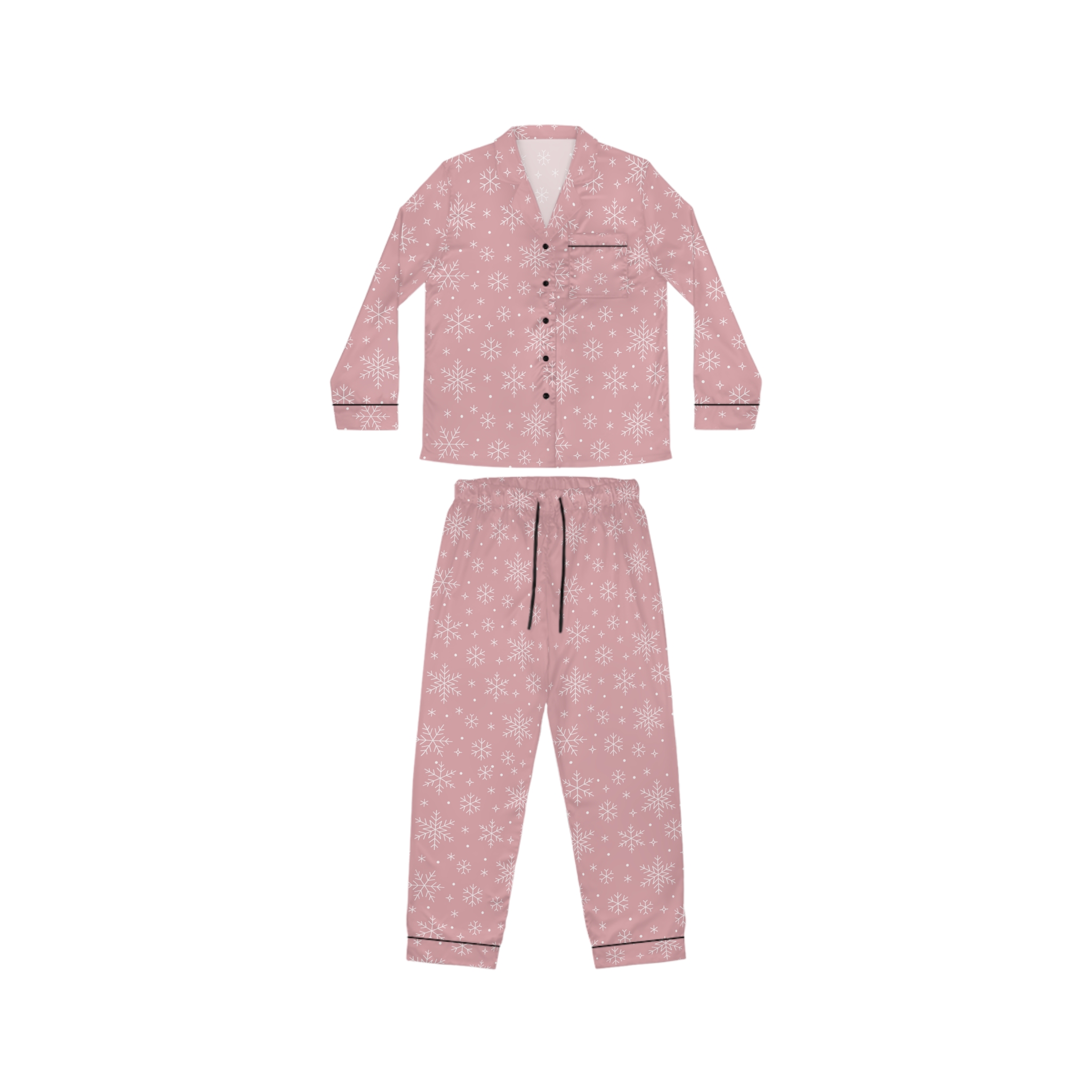 Sink into quiet winter evenings with these satiny pajamas — a soft, lightweight set that moves with you. The classic notch lapel and button-front shirt bring a touch of timeless comfort, while the drawstring waist lets you fine-tune the fit after a long day. The warm, neutral snowflake pattern reads cozy and understated, pairing well with a mug of tea and a book by the window. Smooth satin against the skin, subtle black trim details, and thoughtful stitching make this set feel considered and calm — the kind of loungewear that turns simple rituals into slow, restorative moments.