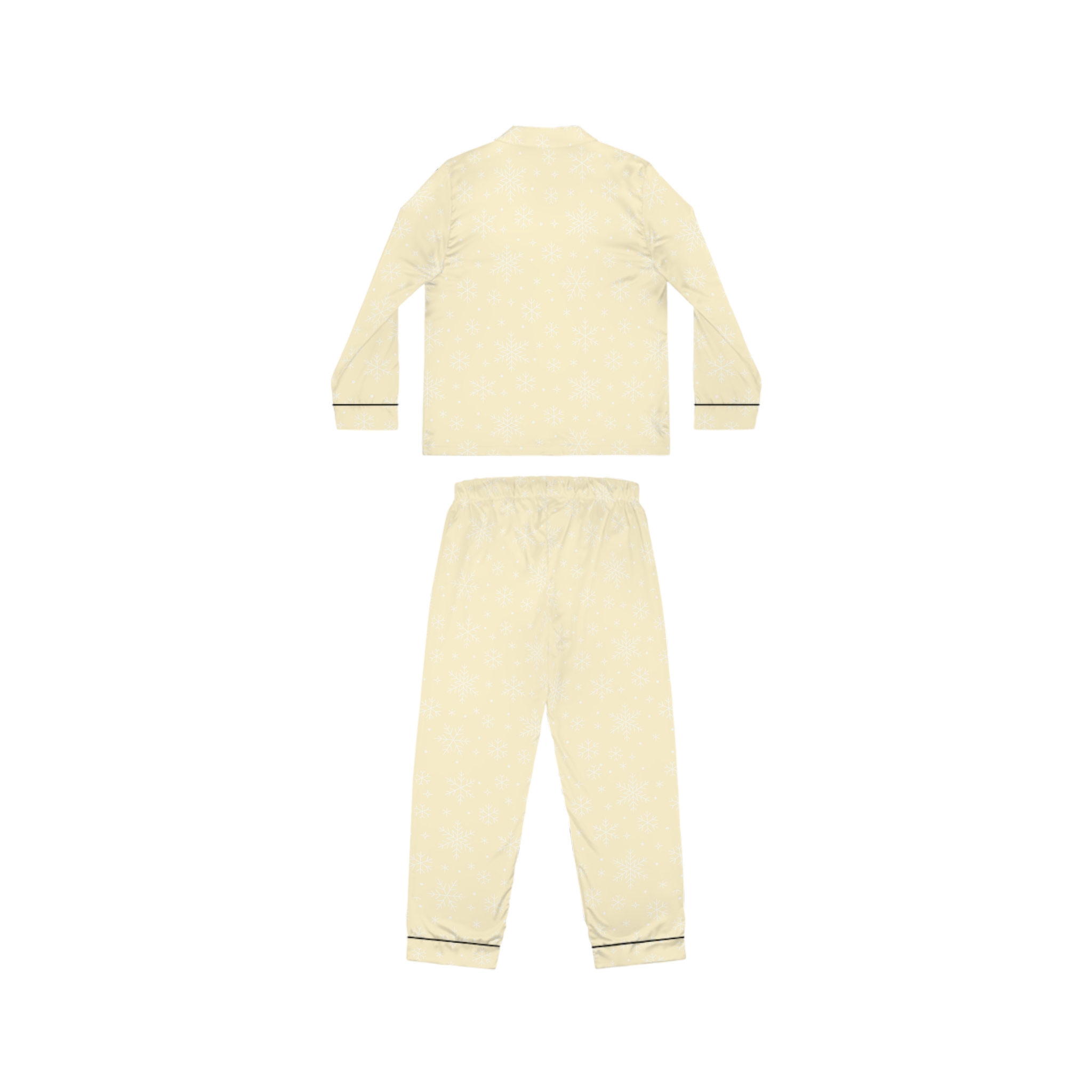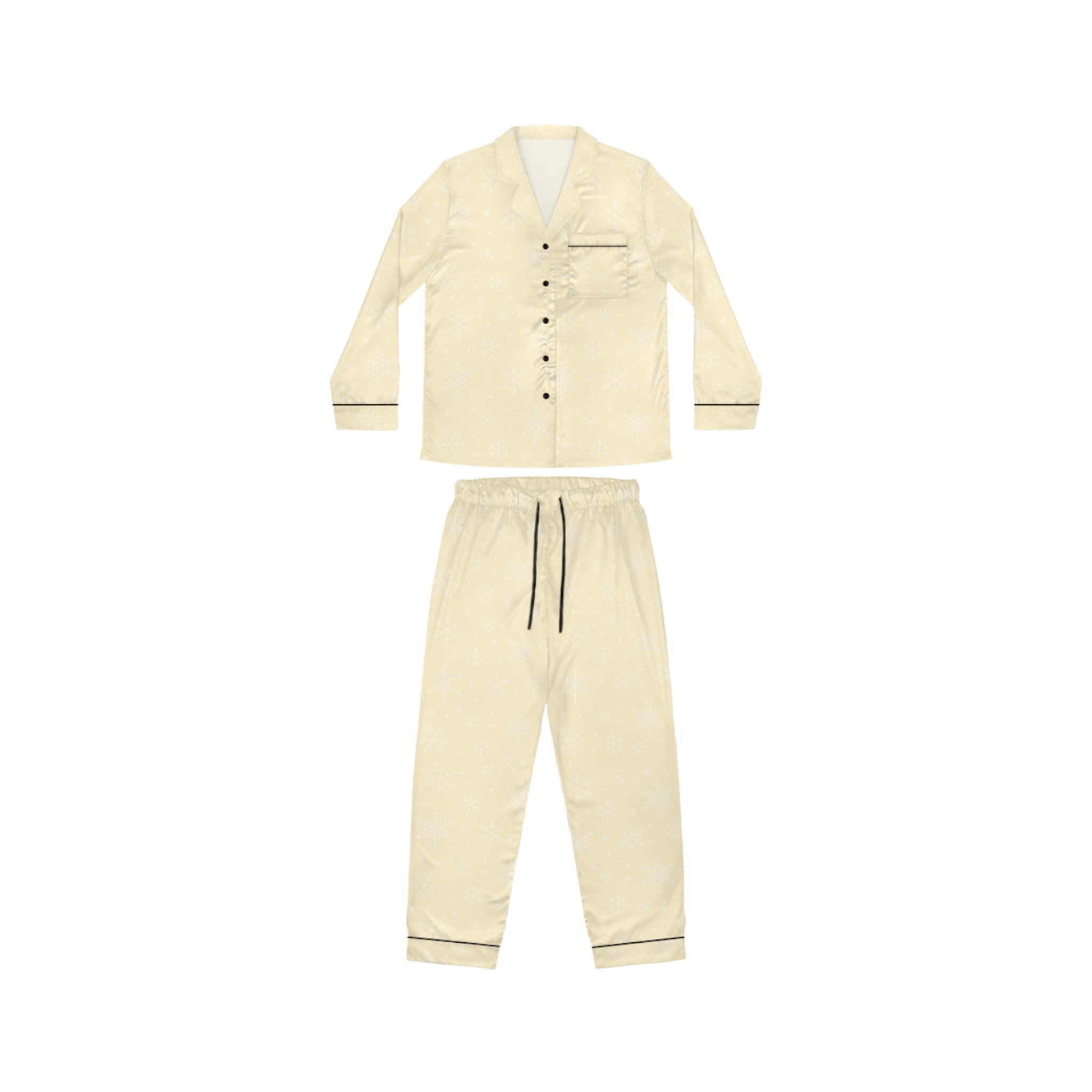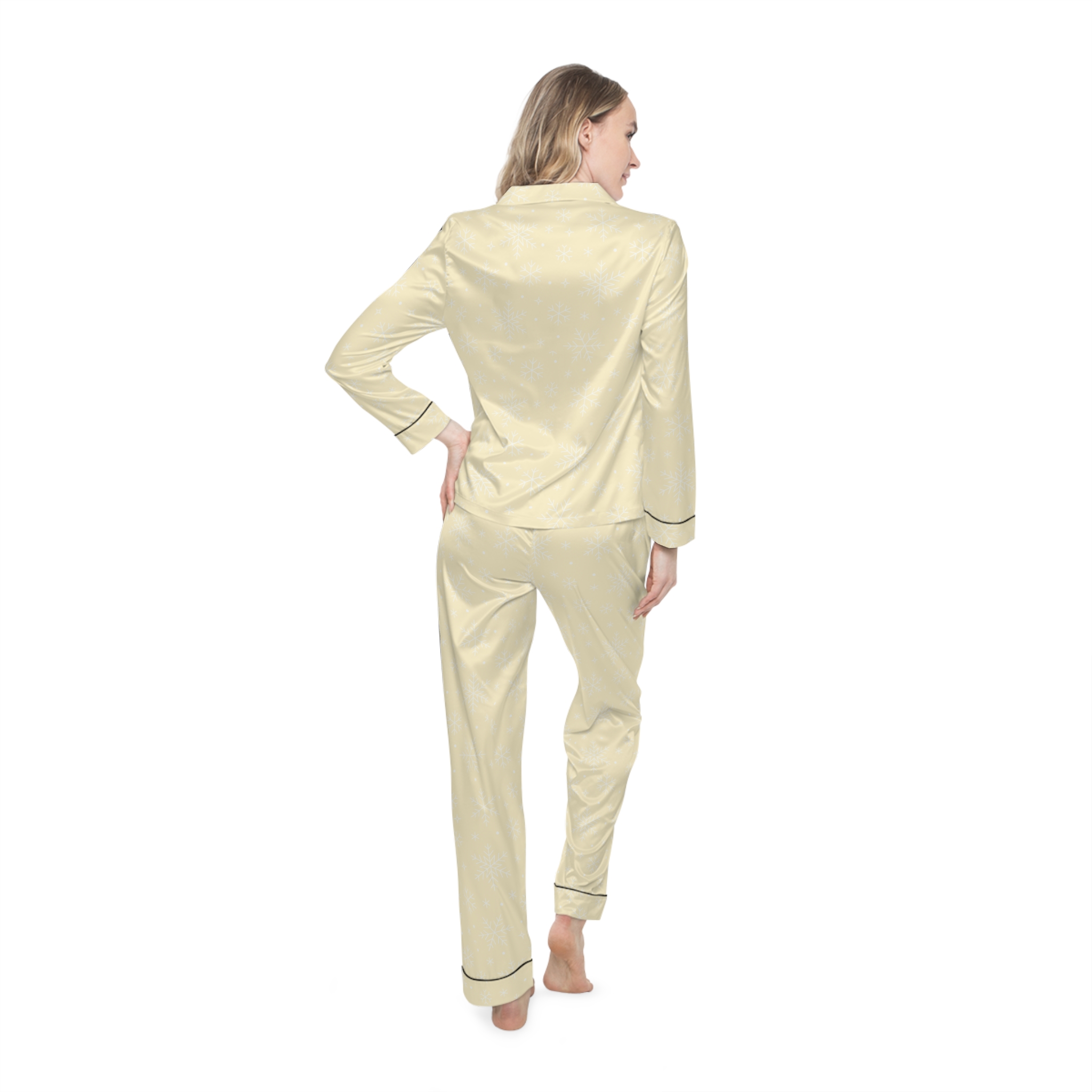 Sink into quiet winter evenings with these satiny pajamas — a soft, lightweight set that moves with you. The classic notch lapel and button-front shirt bring a touch of timeless comfort, while the drawstring waist lets you fine-tune the fit after a long day. The warm, neutral snowflake pattern reads cozy and understated, pairing well with a mug of tea and a book by the window. Smooth satin against the skin, subtle black trim details, and thoughtful stitching make this set feel considered and calm — the kind of loungewear that turns simple rituals into slow, restorative moments.